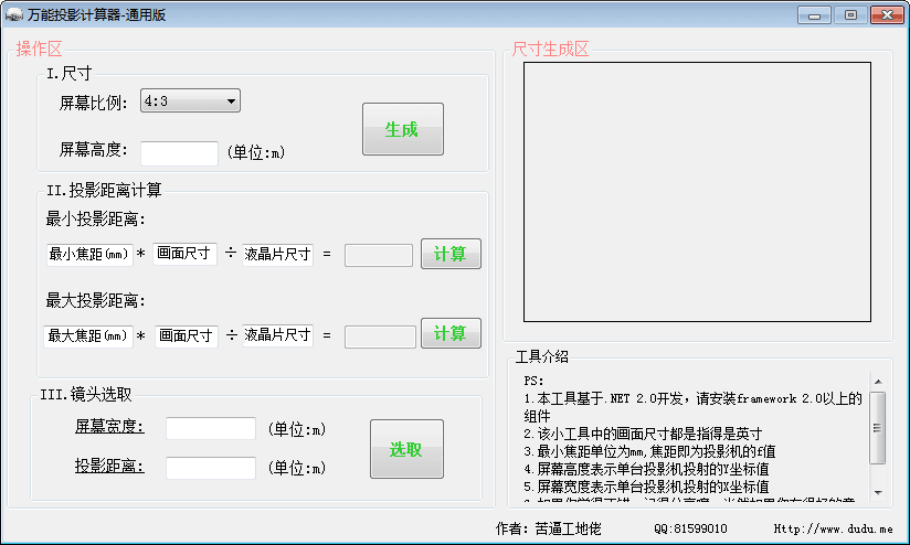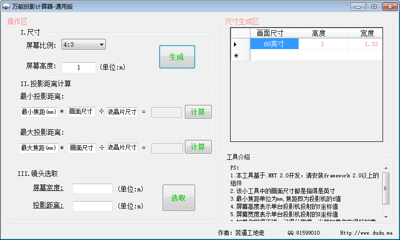 万能投影计算器是一款优秀的投影距离计算器软件,该软件主要用在多媒体展览馆、规划馆、地产行业展示厅的投影机选型和投影机投影距离计算和投影机镜头选取的工具,它所计算的投影距离非常精确,用户可以放心使用。