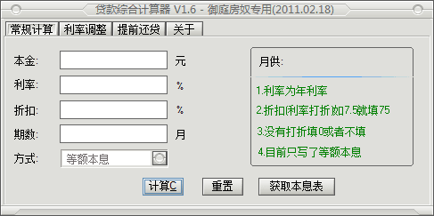 贷款综合计算器是一款专业的房贷款计算软件,能够进行常规计算、利率调整计算、提前还贷计算。该软件小巧实用,操作简单,对于买房还贷的用户来说,是一款非常有用的小软件!