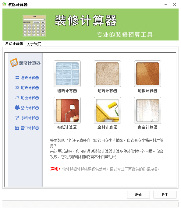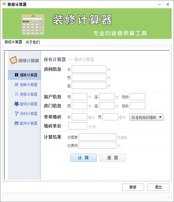 装修计算器是一款专业的装修预算工具,该软件提供墙砖计算器,地砖计算器,地板计算器,壁纸计算器,涂料计算器,窗帘计算器等多个计算工具,界面美观大方,使用方便,简单快捷!