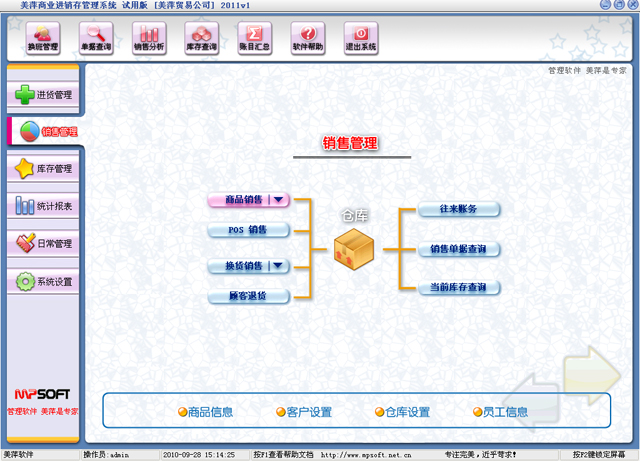 美萍商业进销存管理系统是一款专业的销售管理软件。美萍商业进销存管理系统具有强大的报表功能,让您随时了解企业经营情况,其独具特殊的客户管理,员工管理,让你管理更省心。此外,它集成BS服务器端,可以远程查询库存,让所有查询都简单方便。