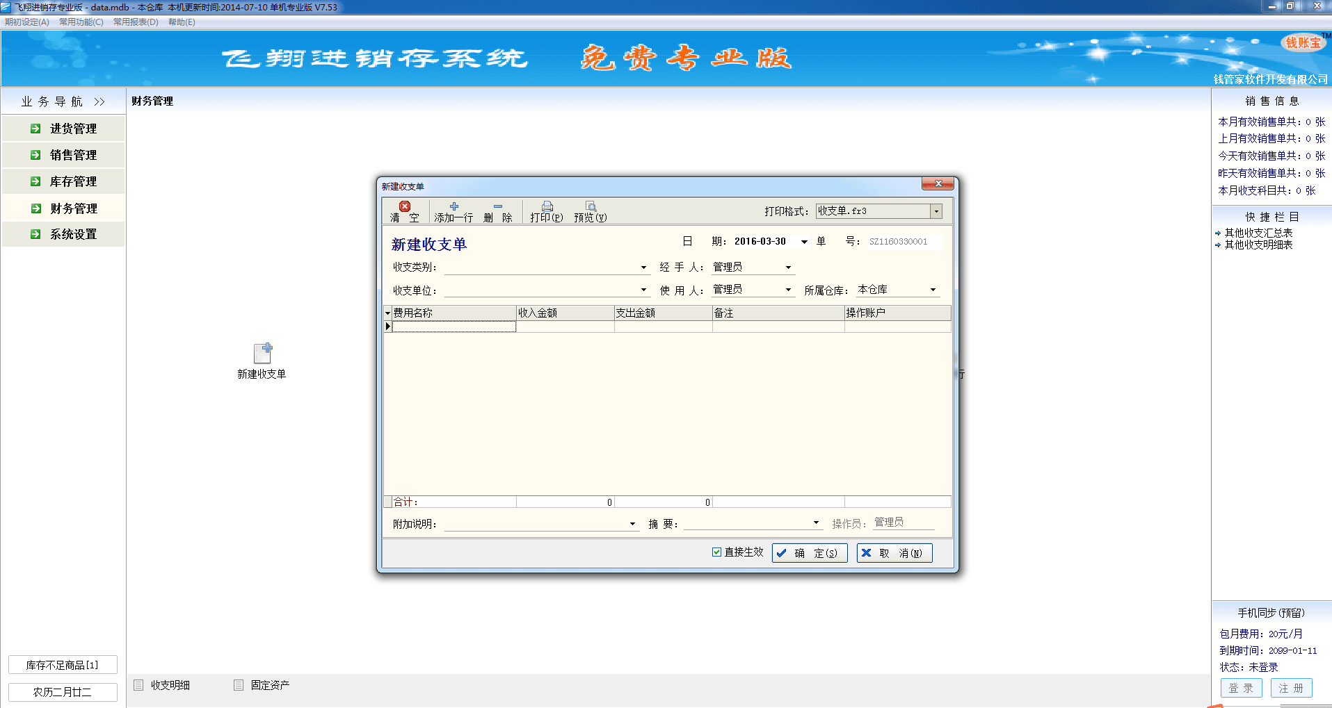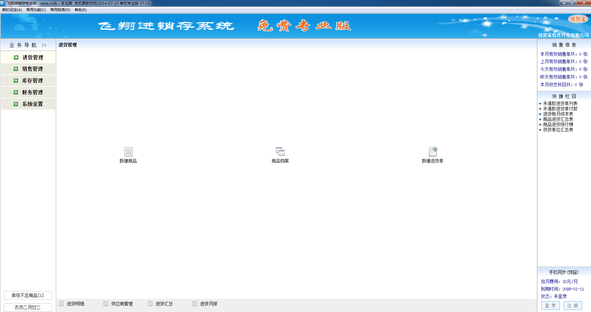 飞翔商铺进销存系统是一款简单实用、容易上手的进销存软件。软件集“财务明细账”和“商品明细账”功能于一体,商品明细账、钱流明细账,销售利润直观可视;软件支持自定义打印单据报表的格式;支持全面权限控制、加密运行安全稳定。