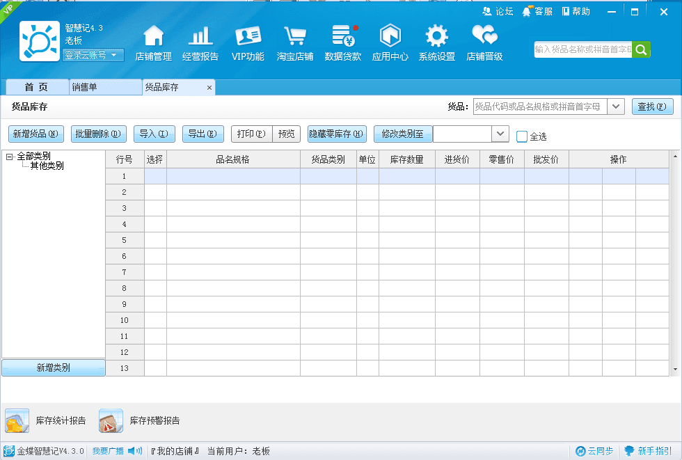 金蝶智慧记是一款专门为个体商家量身打造的免费进销存软件。系统简单易用,灵活方便,无需专门培训,使您轻易由手工账本转换为电子账本,充分享受电脑管理为您带来的轻松便利。