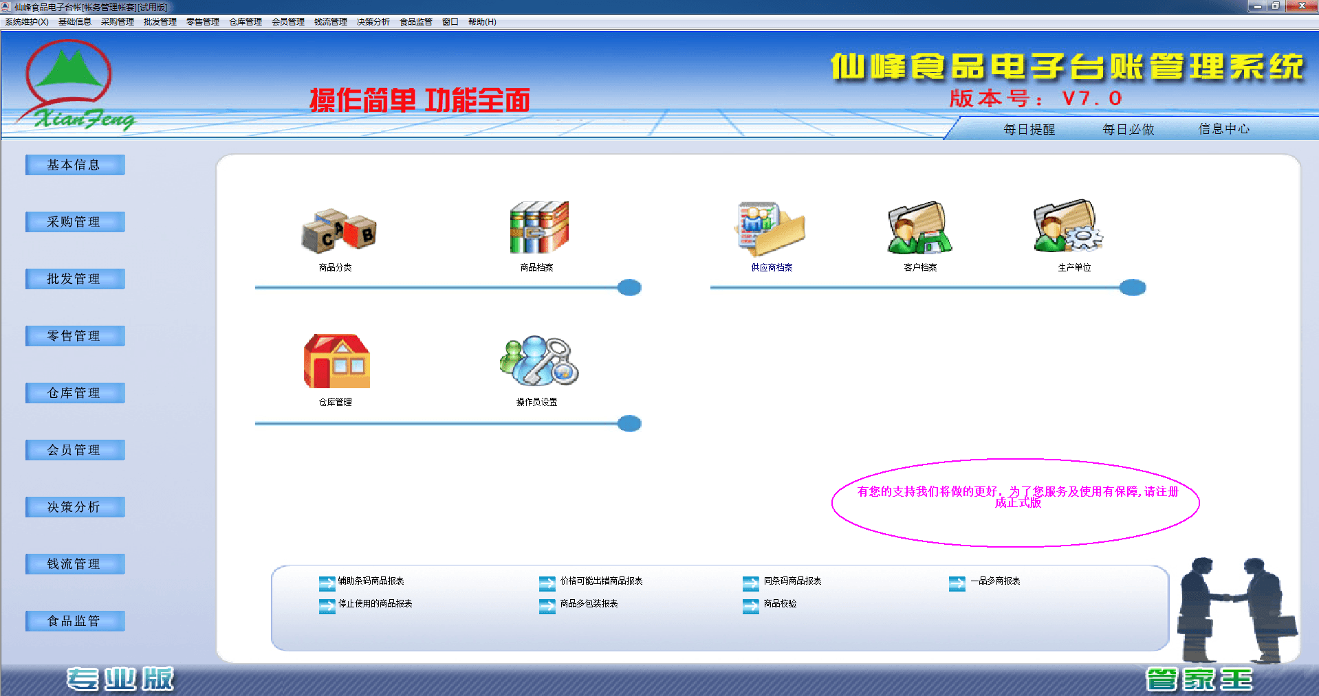 仙峰食品电子台账管理系统是一款面向食品经营商食品进销存一体化的优秀应用软件。每次的进货、销货信息录入后,可自动生成国家工商总局要求的进货台,符合工商监管要求的购销台帐,所开出的供货凭证又能作为食品经销商的进货台帐。