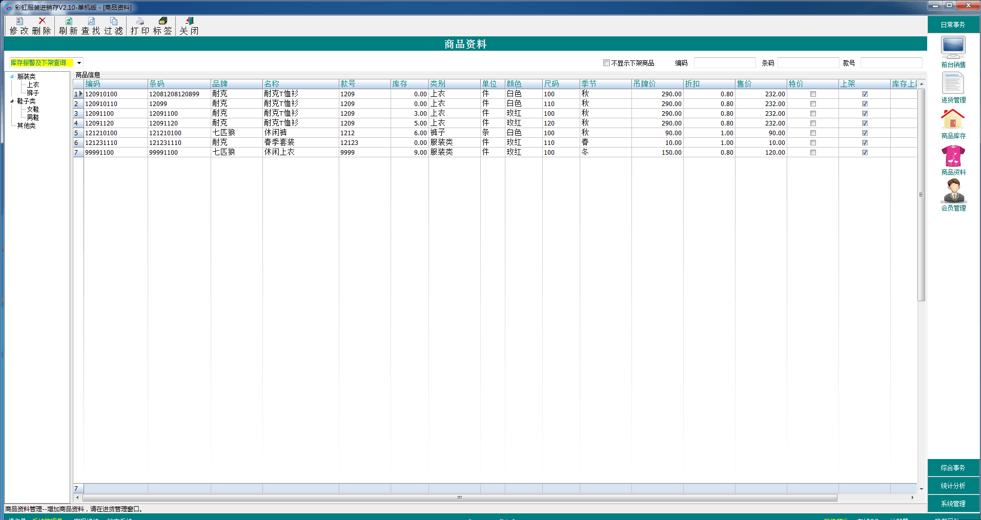 彩虹服装进销存是一款界面友好、操作简单的进销存管理软件,适用于批发、零售、连锁店等业务。界面简洁、功能全面、易学易用。无需培训即可快速上手,轻松完成日常经营管理中的进货、销售、库存、查询等业务。您还可以随时通过上网了解店面数据,让您真正做到管理无忧!