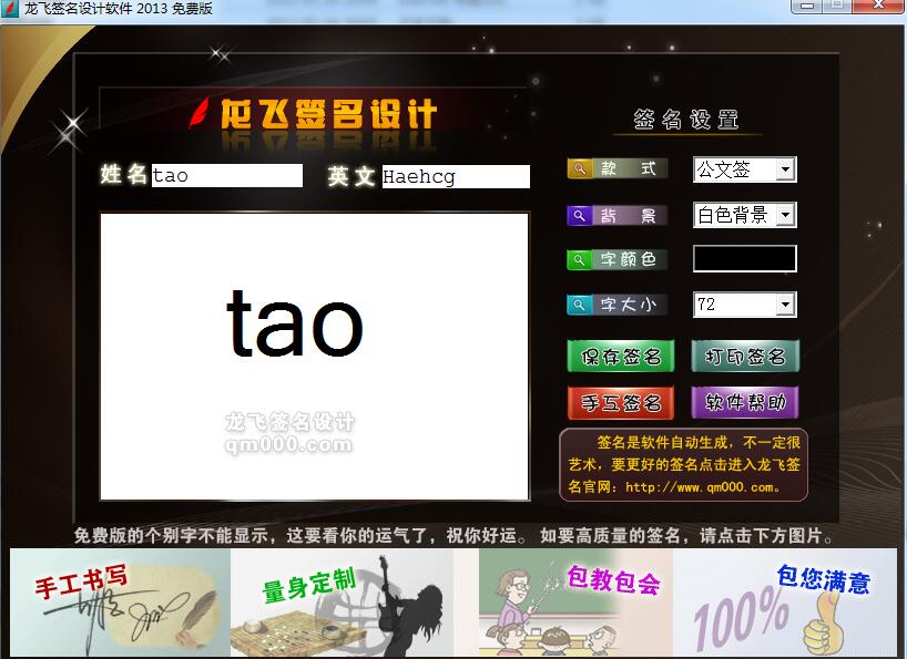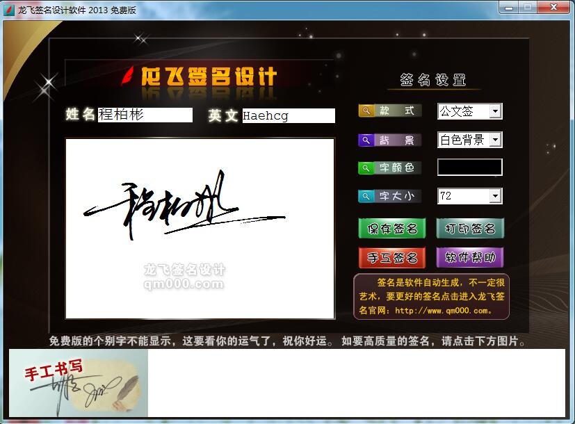 您只需要输入您的中文名字,或者英文字母,系统就会立马生成4款独特的签名,该软件还可以实现反色效果,签名保存为图片后就可以直接打印,软件还可以提供复姓社计。使用起来很方便,还提供英文签名设计,设计出的字体非常好看,也很好学习!