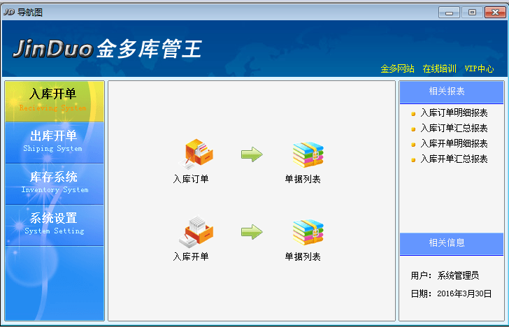 金多库管王5000是目前国内佳企业级仓库管理系统。软件提供全方位的入库订单、商品入库、商品退回;出库订单、商品出库、商品退回;仓库调拨、商品组装等功能,是一款界面伙伴、灵活、易操作、通用性强、实用性高的货物管理软件。