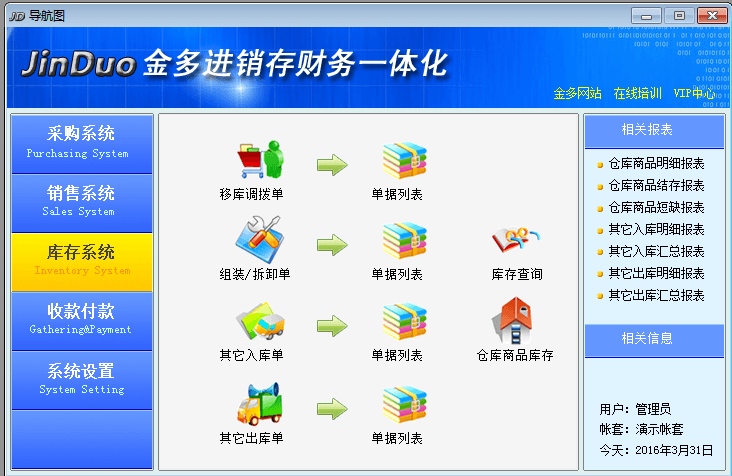 金多进销存财务一体化是市面上真正实现订\进\销\存\仓\财务的一体化的经营管理软件。软件业务功能全面,具有简单结帐按钮设计,一分钟实现企业期末自动财务结帐,并能智能跟踪公司及个人盈利,提供各种商品报表、报告,一目了然,做忠诚的经营总监。