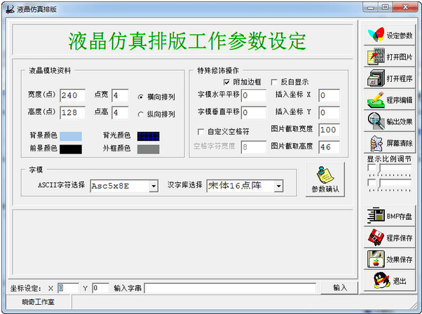 液晶汉字模提取工具是一款支持自动添加下划线、自定义特殊字符、点码阵随意平移的工具。可以在你动手编写单片机程序之前,先做规划排版,根据你的菜单内容进行布局花一点时间在排版上是有好处的,在进行单片机编程的时候,排版通过的坐标很有用,