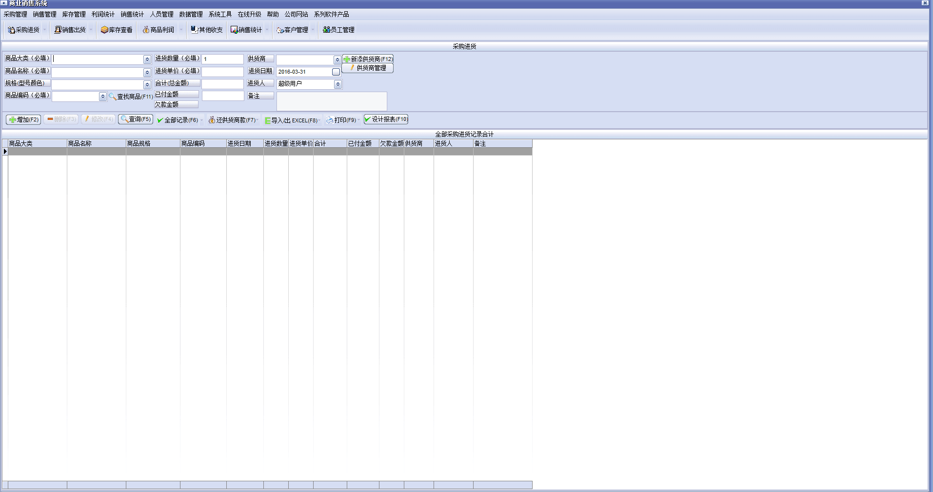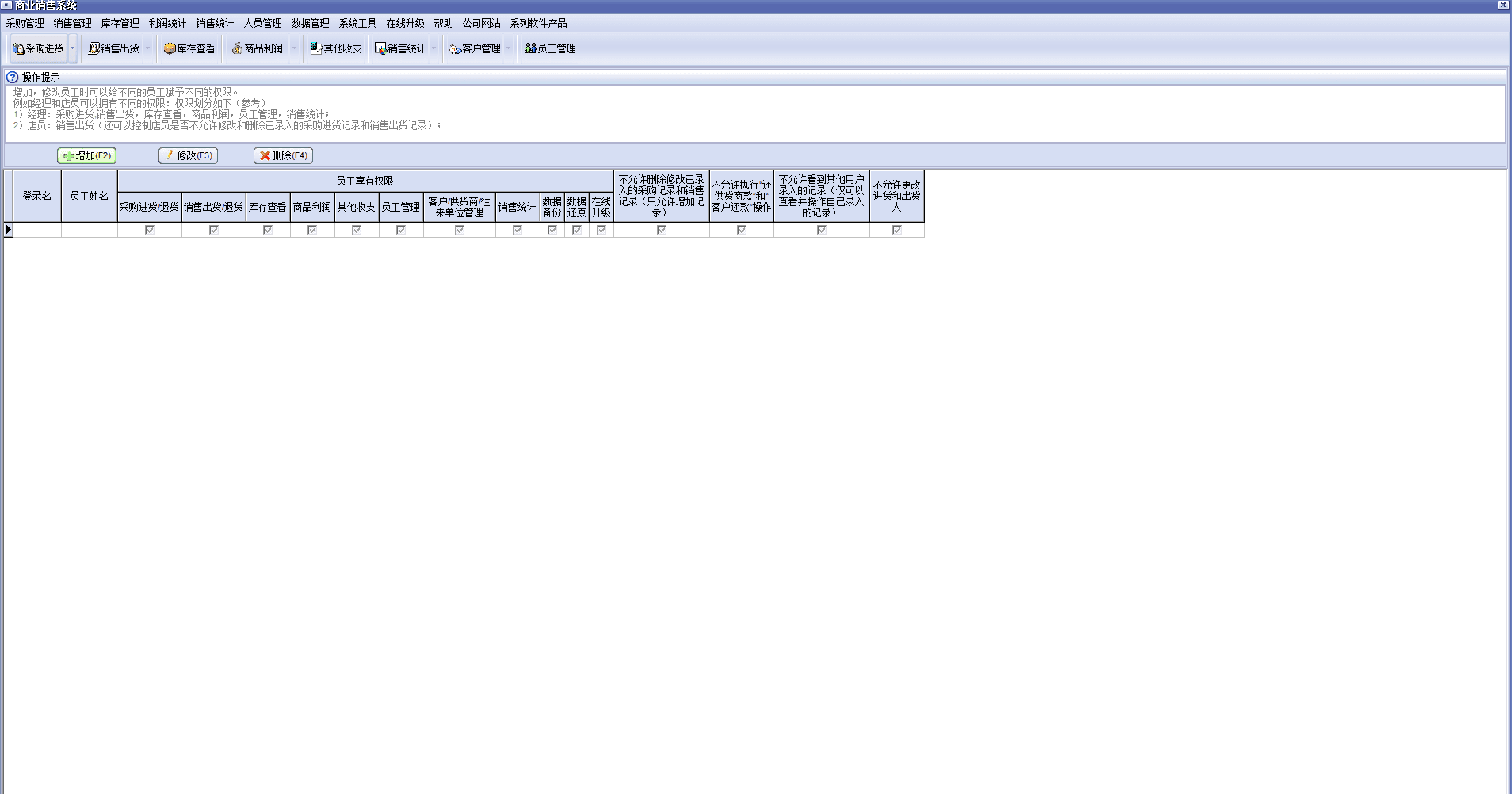 万能进销存软件是专为中小型企业、店铺开发的进销存软件,软件使用简单、方便,功能完备实用,上手快。员工权限自由分配。可以指定员工只有销售商品的权限,而经理则拥有进货,销售,统计等所有权限。数据备份,数据还原功能有效地保护您的数据不会丢失。