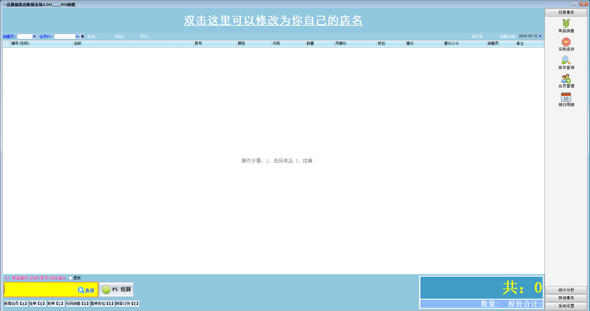 一店通服装店收银软件是一套非常简单、实用、易用的服装零售行业收银管理软件。界面友好美观,前台收银操作方便快捷,基础资料支持Excel的灵活导入,减去了您繁重枯燥的数据输入工作!完善的数据备份和数据自动维护功能,让您的系统永远都是高效、健康、完整的!