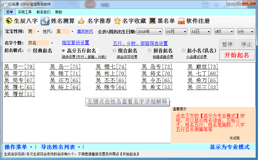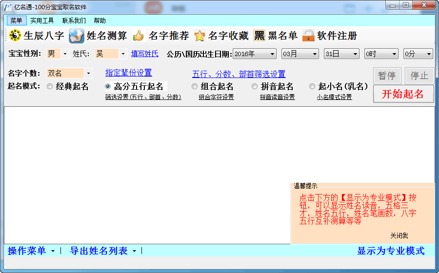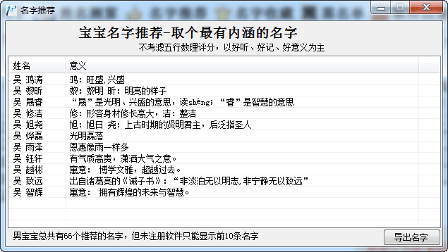 100分宝宝取名软件是一款功能强大的取名软件,软件参照姓名学原理、八字、喜用神、名字吉凶、字辈、名字长度等条件,从海量姓名中为你的孩子挑出匹配的那几万个名字,然后利用筛选功能选出好的那个,让你的孩子出生就拥有一个完美的名字。