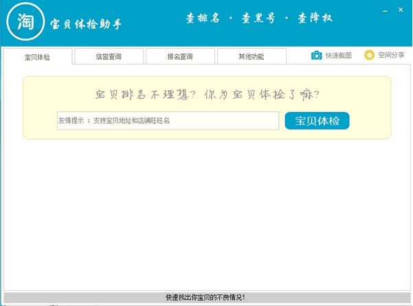 淘宝宝贝体验助手是一款能够帮助用户快速轻松的而管理店铺的宝贝,提高商家管理能力,增加营业额的实用工具。还能帮助用户快速进行淘宝排名查询、信誉查询等。