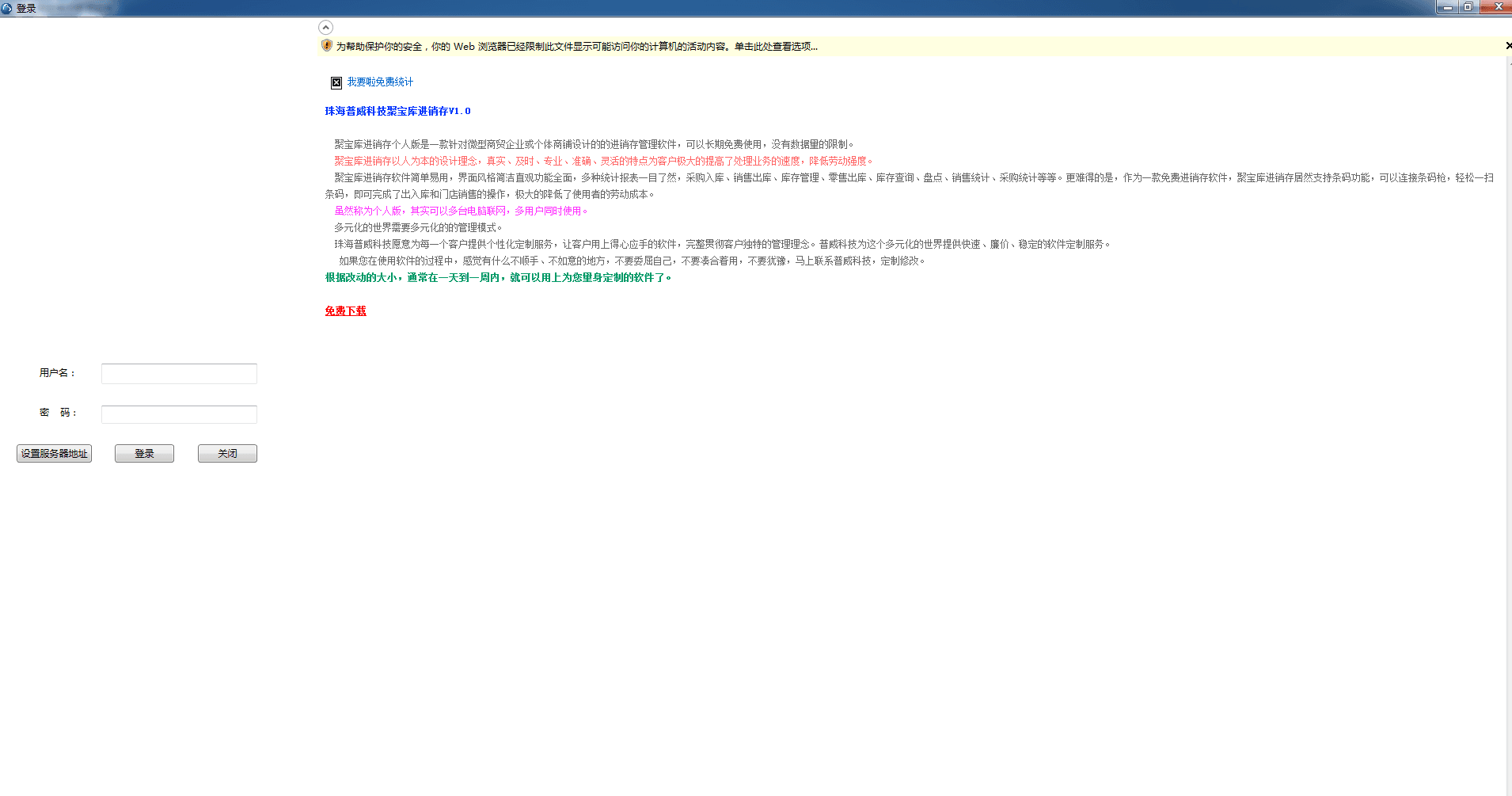 聚宝库进销存是一款针对微型商贸企业或个体商铺设计的的进销存管理软件。软件简单易用,界面风格简洁直观功能全面,多种统计报表一目了然。支持条码功能,极大的降低了使用者的劳动成本。欢迎下载使用!