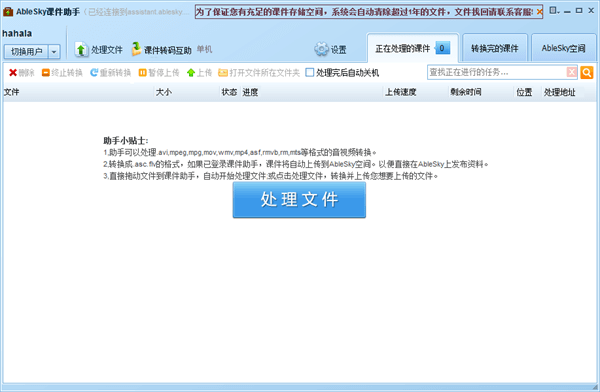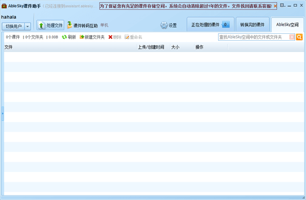 能力天空课件助手是一款简单实用的课件上传处理工具,独创课件互助转码功能,只需知道对方IP即可帮忙转换课件。支持自动将视频文档转换为网校课件并上传,操作简单。