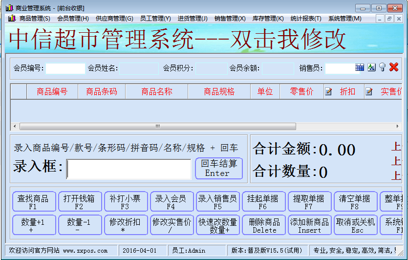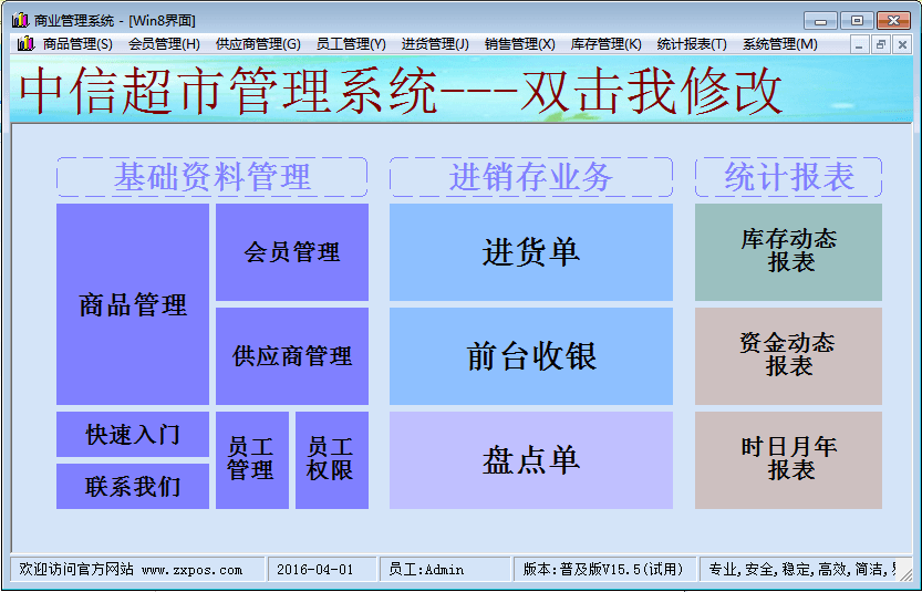 中信超市收银管理系统是一款专为商店、超市、专卖店等开发的管理软件。该软件有基础资料管理、进销存管理、前台收银、财务管理、统计报表等功能。