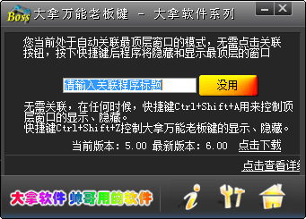 老板键是一款一键程序隐藏工具,专门为学生党和上班族设计的。主要功能是能够通过事先设定好的快捷键瞬间隐藏掉多个事先设定的窗口。有需要的朋友欢迎点击下载!