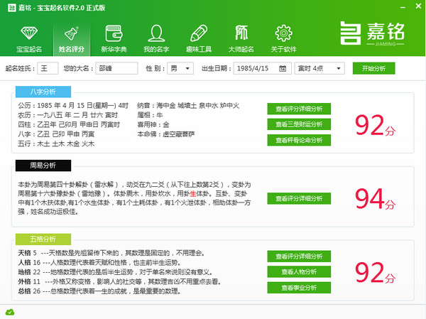 嘉铭宝宝起名软件是一款功能强大的起名软件,提供双胞胎起名、英文起名等多种起名模式,可以从字形、字义、音韵、音调、五行等多个方面进行智能分析起名,是好用的起名软件。