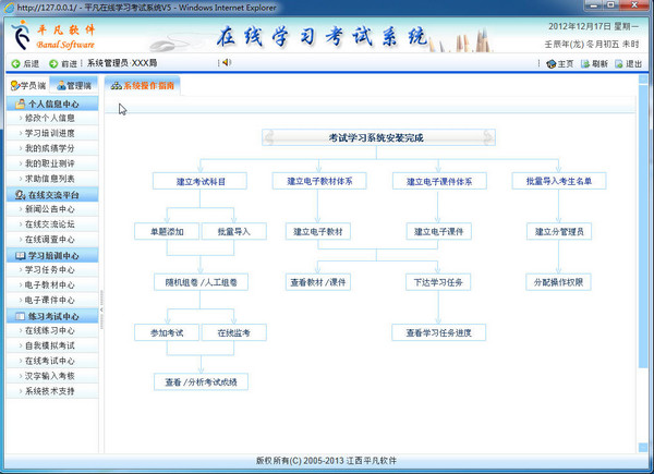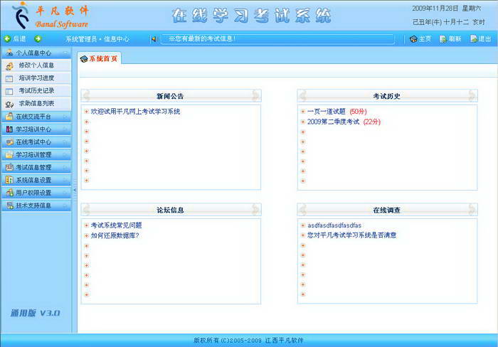 平凡网上考试系统是一套在网上考试、作业练习的考试练习软件。充分考虑到各行业中不同的考试需求特点,特别针对大中型企、事业单位作了更为周到的考虑,符合各机构培训学习、考试管理。欢迎下载试用!