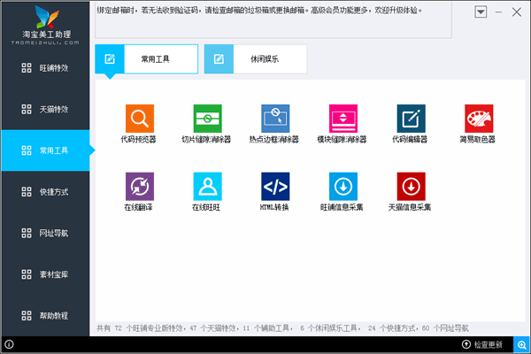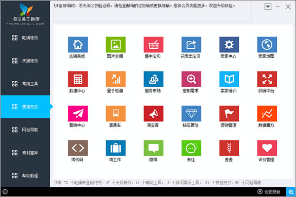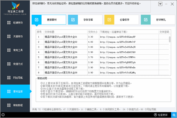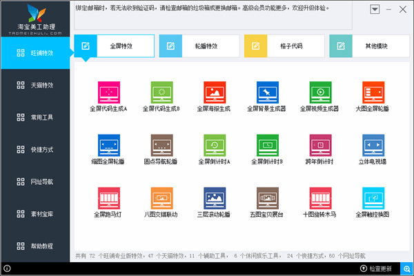 淘宝美工助理是一款功能强大的淘宝店铺特效代码生成软件,你只需图片空间的图片地址和宝贝的链接地址,即可自动生成各种特效代码,包括常见的CSS+JS特效,还提供了海量素材库供你参考,让你轻松美化网店。