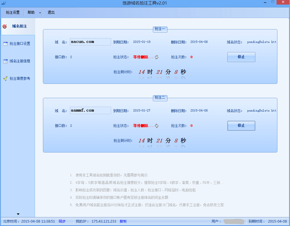 悠游域名抢注工具是一款可以免费高效的帮您抢注域名的软件,这款软件不需要人一直守在旁边,您只需要设置好各种参数,这款软件就会帮您在短的时间里抢注到您想要注册的域名。