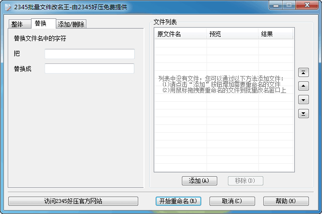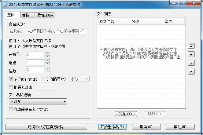 2345批量文件改名王是一款用来同时给多个文件重命名的软件,可以帮助用户节约时间,提高工作效率。软件体积极小,但功能十分强大,是一款十分优秀的文件改名软件。