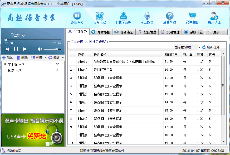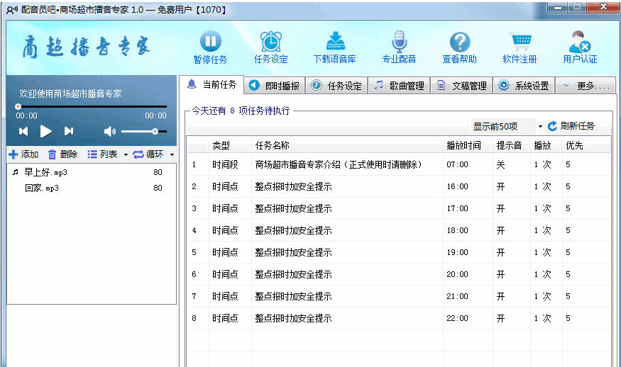 商场超市播音专家是一款专门用于超市音乐播放、语音广播、定时播音的播音软件。软件可对播音任务进行时间上的精准定时,设置提示音、增加背景音乐、设置音量等,发音自然标准,支持多语种、多音色,实现真正意义的无人值守!