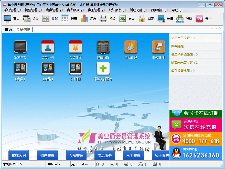 美业通会员管理系统软件是一款界面简洁、功能强大的会员管理系统软件。强大报表与集成查询功能是本软件的大特色,所有功能在用户需要的使用地方自然体现。能满足各个行业的需求,可灵活定制设置,方便快捷。