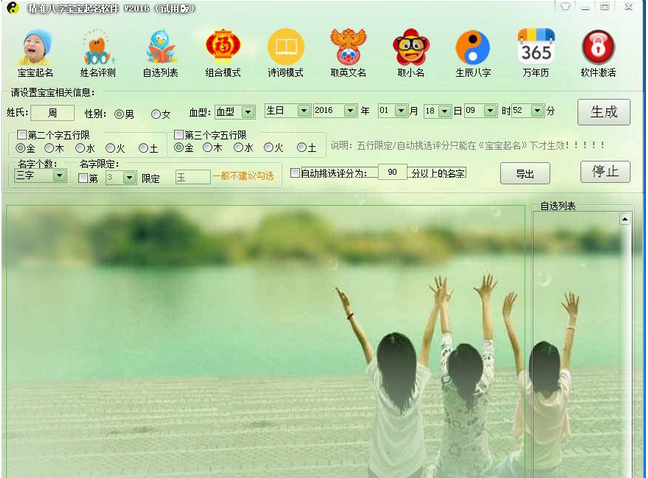 精准八字宝宝起名软件是一款专门为孩子取名的软件,每一个新当上父母的人都希望能给孩子取一个有文化内涵的好名字,这款软件就是根据孩子的生辰八字来取名字的软件,不仅能去个好听又内涵的名字,还能为孩子的将来命运逢凶化吉。