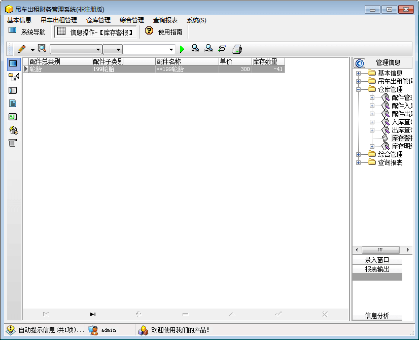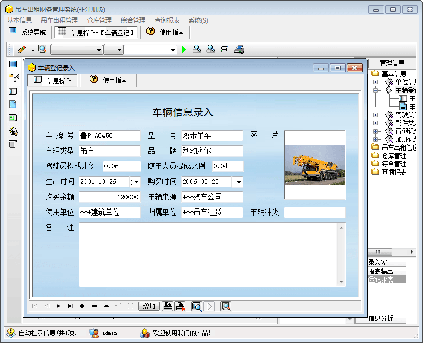 吊车出租财务管理系统是一款针对用于吊车出租公司使用的车辆财务管理软件。该软件功能强大、操作简单灵活,是出租公司的佳选择。