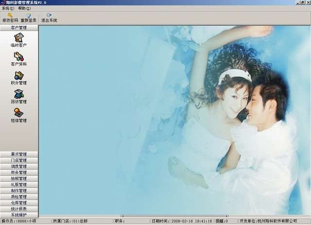 翔科影楼管理系统是一套功能强大,技术先进的影楼管理软件。软件包含了从客户预约到后的取件、反馈一系列的管理流程,其权限可以经管理人员随意开设,精简了不需要的繁琐流程,提升了服务质量,提高了市场竞争力!