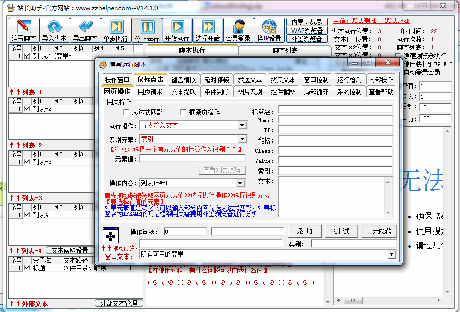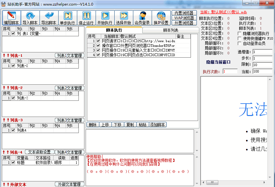 站长助手软件是一款可以轻松简单上手的seo辅助软件。软件不需要懂编程知识即可操作,类似按键精灵;持续不断更新优质脚本,价值超软件自身,支持联众打码、UU、打码兔等自动打码平台;让每天高度重复的工作自动化,让工作变的更轻松。