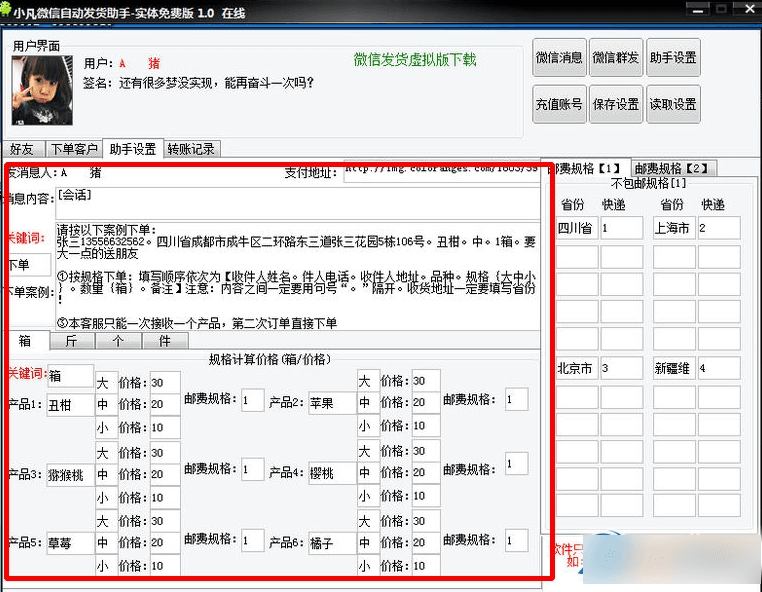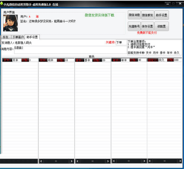 小凡微信自动发货软件是一款专门用于微信微商自动发货的软件,这款软件非常适合喜欢玩微信群或者从事微信推广营销的微商朋友使用,支持微信群发,微信自动回复,微信下单自动发送,操作简单的微信自动发卡软件。