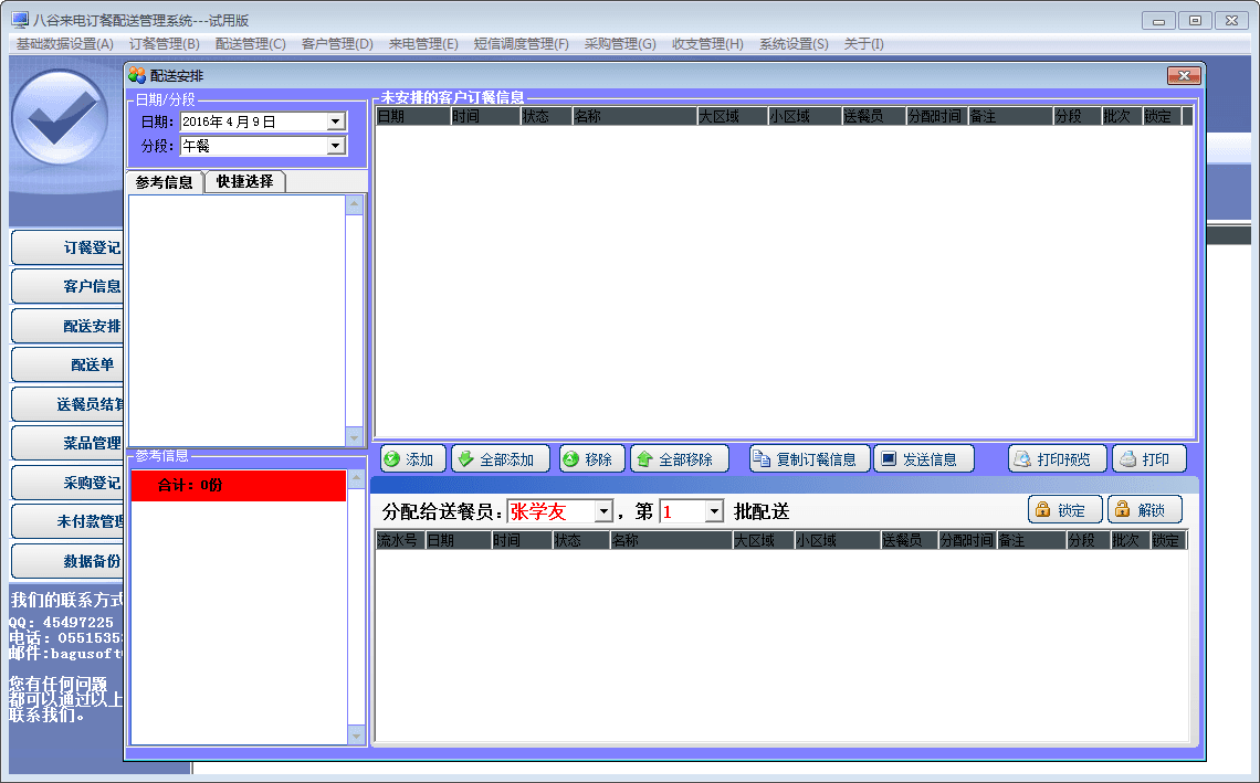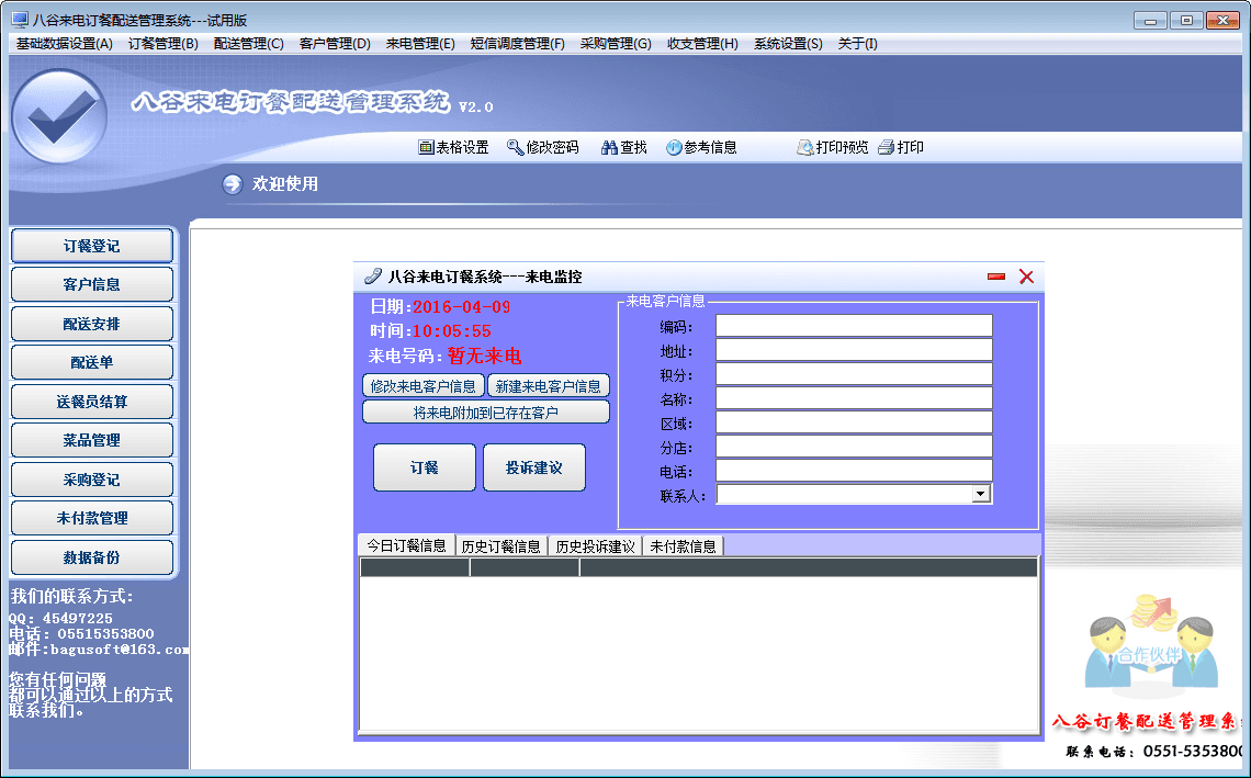 八谷快餐配送系统是一款界面简洁、简单易用的快餐订餐与配送管理的软件。该软件支持分店管理模式,分区域配送功能,除此之外还支持来电订餐功能,客户来电,系统将显示来电客户名称,方便订餐。