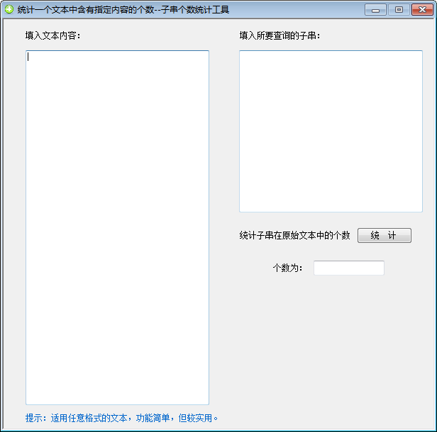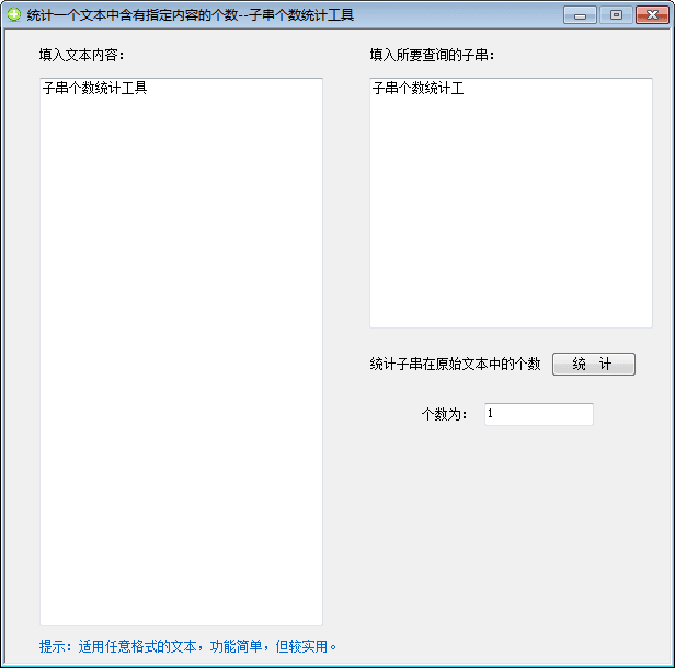 子串个数统计工具是一款统计子串个数的软件,软件统计出任意文本格式中含有某个子串的个数。软件可以统计指定的某些特殊词汇的出现词频,可以>选择只统中文词汇、英语词汇或标点符号。