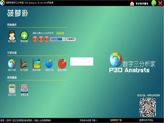 菠萝彩数字三分析家是一款专门用于国家福利彩票的分析投注软件,福利彩票大家平时都喜欢买的玩玩,买中了就是福气,没中就当做好事做福利捐出去的。这款软件是针对3D福彩和体育彩票这两大类彩票的分析软件,喜欢买彩票的玩家是非常适合这款软件的。