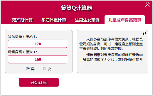 笨笨q计算器(孕妇预产期计算器)是一款小巧的计算器,适用于孕妇预产期计算,可以预产期计算、孕妇体重计算、生男生女预测计算,儿童成年身高预算等功能。软件小巧绿色,免费实用,“造人”更有理了!