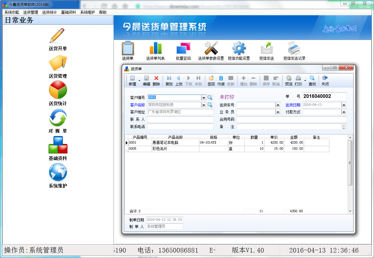 今晨送货单软件是一款绿色免安装、功能强大的送货单打印软件,本软件集送货单管理、产品资料库管理、客户资料库管理、月结对帐单单管理、数据分析、图表分析等功能,软件集成了“产品资料库”、“客户资料库”、“业务员资料库”。