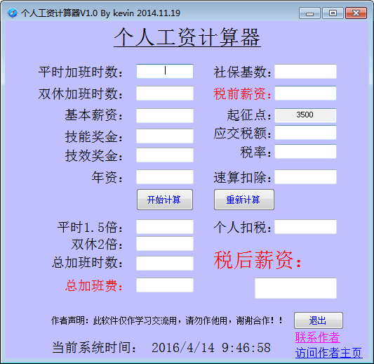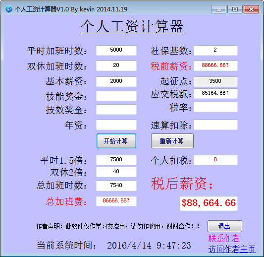 个人工资计算器是一个用于计算个人工资水平的计算器,软件小巧,操作简单,可计算社保、奖金、加班费、基本工资等各项工资指数,还可以计算个人所得税,试一试你就知道有多么好用!