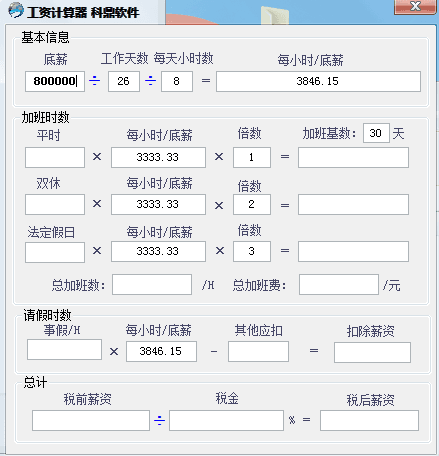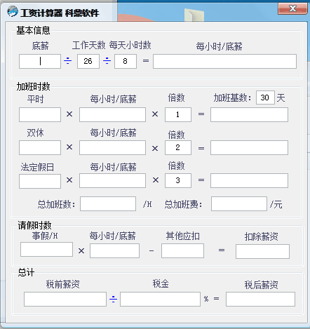 科鼎工资计算器是一款实用的工资计算软件,该软件非常小巧,操作也简单方便,利用该软件,可以快速的计算出每月所得工资、加班费、税前税收的收入,非常好用!
