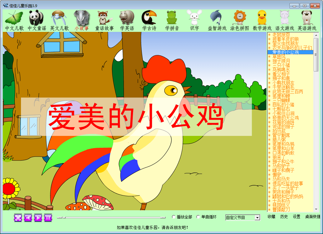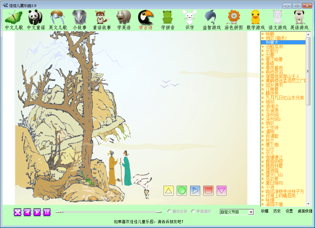 佳佳儿童乐园是一款优秀的儿童启蒙软件,该软件精心收集了儿歌、故事,还有游戏和训练,操作简单,孩子自己就能独立使用,界面清新简洁,符合儿童心理特点。有了佳佳儿童乐园,孩子就能轻松学习,快乐成长!