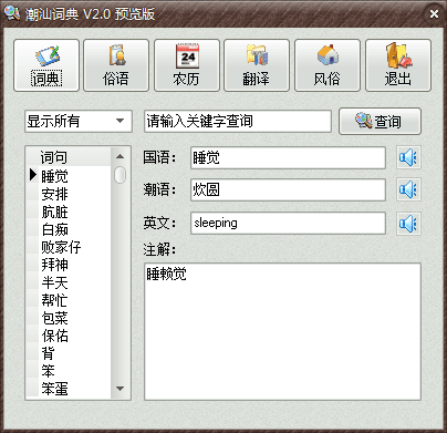 潮汕词典是一款简单易用的词语查询工具,主要以查询潮汕地区方言俗语为主,包括词典、属于、农历、翻译以及百科5个模块,界面简洁友好,支持语音朗读功能,是传承古汉语文化的必要辅助工具,欢迎下载使用。