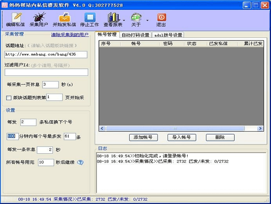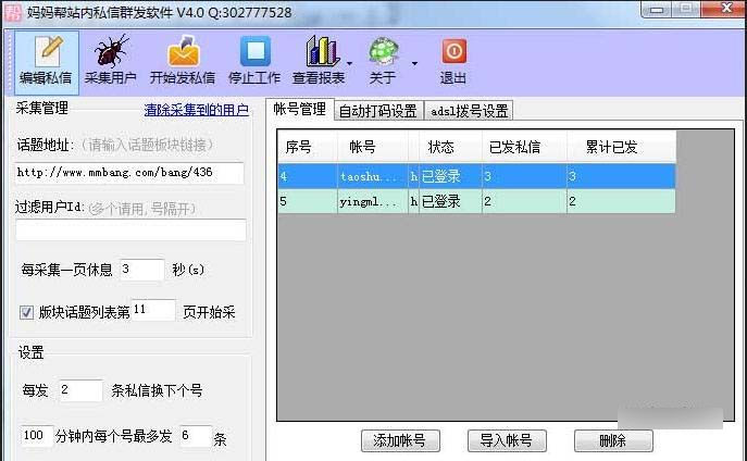 妈妈帮站内私信群体发送软件是一款专门用于私信群发的工具,这款软件的功能非常强大,不仅适合普通用户的个人私信群发使用,还可以用于专门从事与营销推广的各种人员使用。平时对私信用到而比较多或者有需要的网友可以试试。