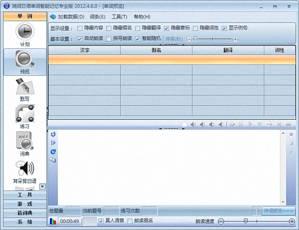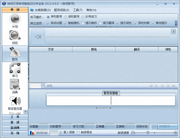 瑞词日语单词智能记忆是一款功能强大的日语学习工具,采用先进的智能记忆引擎技术,帮助用户快速学习日语,坚强日语记忆,软件内含趣味背单词、真人发音朗读、日语试卷测试、智能默写日语等多种功能,操作简单,方便实用。