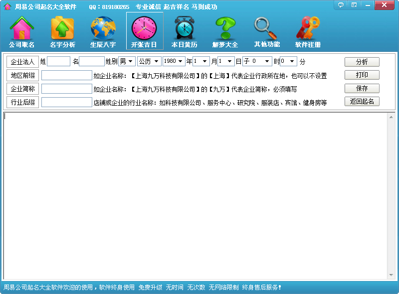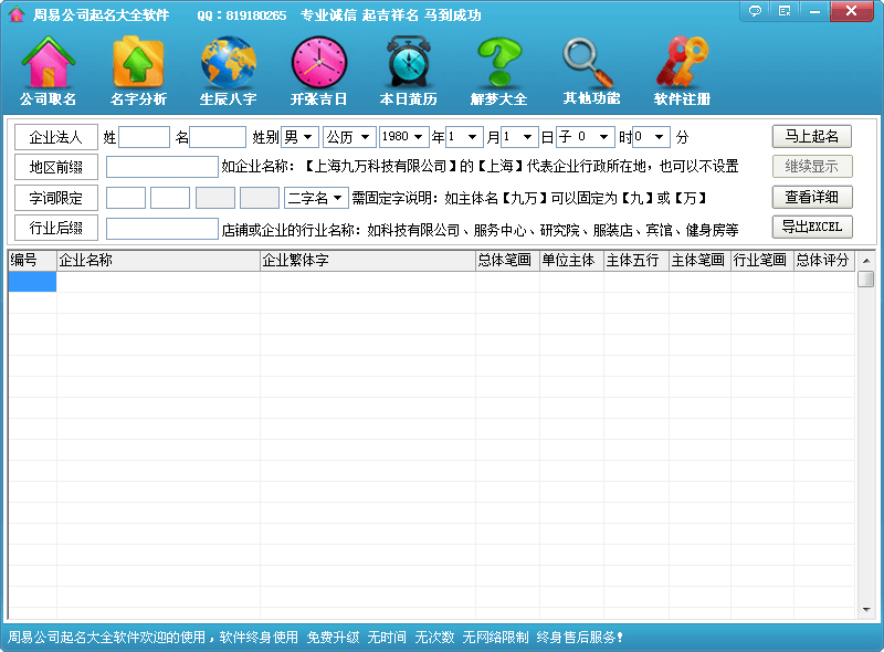 周易公司起名大全软件是一款非常好用的公司取名软件,该软件除了可以给公司取名外,还拥有名字分析、生辰八字、开张吉日、本日黄历等功能,界面友好,操作简单,非常实用!