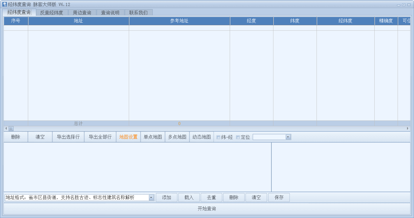 经纬度查询是一款经纬度批量查询工具,该软件可以进行经纬度查询,可以反查经纬度,可以将过于详细或简单的地址更改至 省市区县街道, 再重新解析,非常智能、高效、实用!