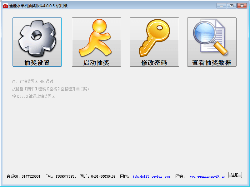 全能水果机抽奖软件是一款优秀的电脑抽奖软件,该软件功能强大,以水果机的抽奖形式,界面可以自定义设置颜色、字体、内容等等,可操作性非常强,是一款好玩又实用的抽奖软件。