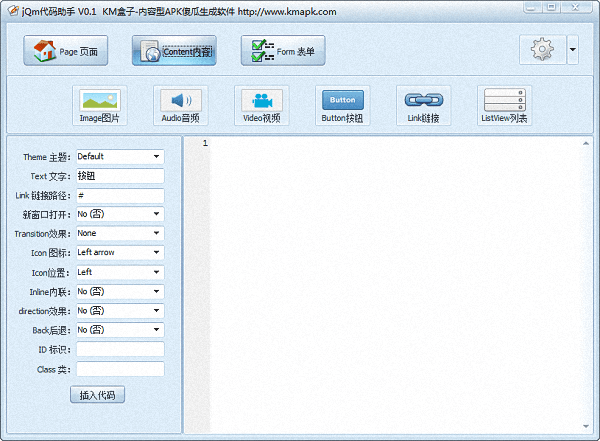 Jquery Mobile(JQM代码助手)是一款简单易用的代码自动生成工具,软件界面简洁清晰,一目了然包括页面page、表单form以及表单content等3个模块,操作简单易上手,安全可靠,非常适合代码初学者下载使用。