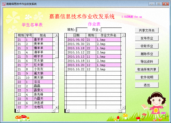 嘉嘉信息技术作业收发系统是一款简单易用的教学辅助工具,包括共享文件夹、发布作业、导出资料、收取作业、取消所有共享以及删除作业6个模块,操作简单,能够让教师通过作业收发情况了解学生学习态度和学习水平。