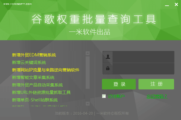 一米谷歌权重批量查询工具是一款帮助用户查询自己网站在谷歌里面的权重的工具,该软件可批量查询谷歌主域及页面权重,没有查询数量及次数的限制,可以按权重高低自动排序,可以按权重排序自动导出数据,重要的是,该软件永久免费!