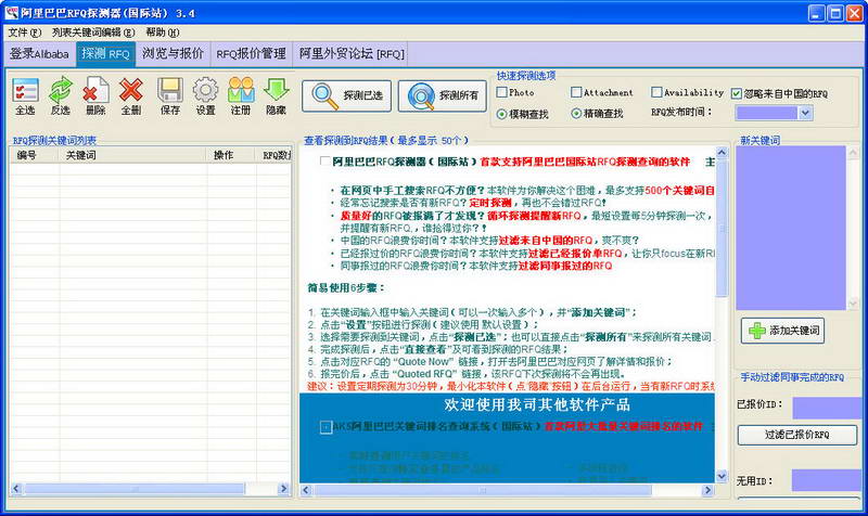 阿里巴巴RFQ探测器是一款自动探测关键词的软件,如果你觉得用网页手工打开搜索RFQ不方便,用网页手工打开搜索RFQ不方便,或者是RFQ被报满了,中国RFQ不想报,同时报过的RFQ浪费你时间,那么你可以试一试阿里巴巴RFQ探测器,完美解决你所有的烦恼!